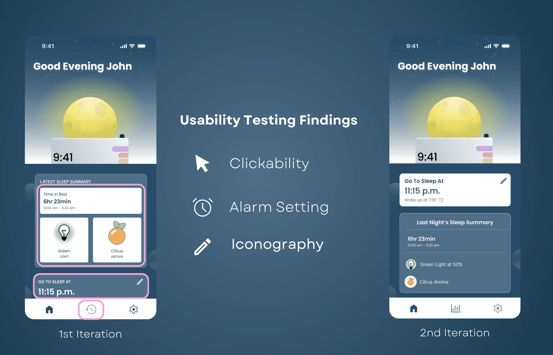 I conducted usability testing and identified several pain points, including difficulties recognizing clickable elements, locating the alarm setting, and confusion caused by unclear iconography.