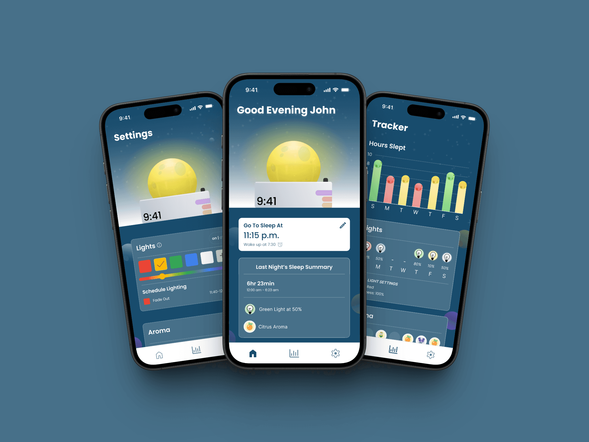 For this project, we investigated environmental factors that impact sleep, which informed key product features such as alarm setting and wake time, customizable light color, and an aroma diffuser.